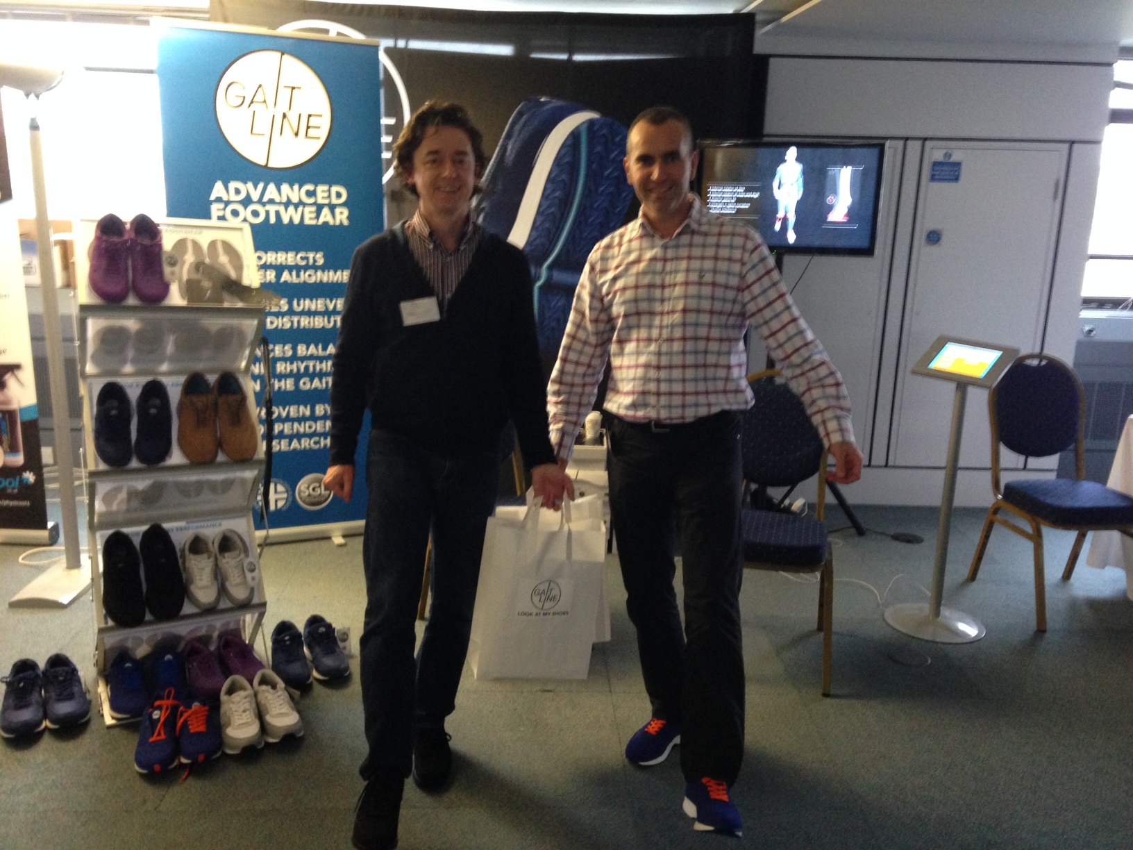 Now, I have come across a number of good footwear products in recent years that take a novel ‘ground-upwards’ approach to reconfiguring our bodies interaction with the walking posture, such examples are ‘MBT shoes’ and `’fit`flops’. Our patients do advocate these products, so I was interested in the Scandinavian approach to walking. To cut a long story-short, after 5 minutes of standing, moving and running around in the GaitLine shoes, I knew I wanted to know more. The intuitive nature of the support and efficiency that appears to stem from the shoes was really fascinating. So……. I bought a pair……and so did Gary!